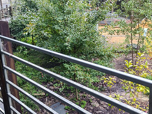 Best viewed from the board walkway, this garden was established in 2021 after a number of large trees were removed to increase sunlight reaching the solar panels on the Care building roof. Smaller, native trees form the new canopy. A pollinator garden was planted below to control weeds and slow the flow of water. This garden needs lots of weeding!