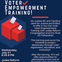 UU Justice NC invites ERUUFians to join Carolina Jews for Justice at Judea Reform Congregation in Durham for a joint voter registration training with You Can Vote! This is an opportunity for us to help build a multifaith coalition to protect democracy and support the UU the Vote campaign! Contact Kaleb Graves or Lonna Harkrader.