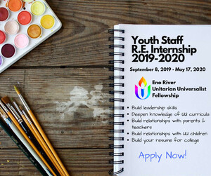 Youth are invited to apply to serve as assistant R.E. Teachers for our preschool and elementary age groups. This opportunity is offered in the spirit of building community, broadening circles, and fostering intergenerational relations. It will provide youth who are ERUUF members a chance to share their love of UUism with the younger generation. The experience is truly emblematic of UU values: covenantal relationships rooted in community and mutual respect. This internship offers youth a chance to practice bringing their UU values into a work environment. Priority will be given to applicants who have completed Coming of Age at ERUUFor another UU congregation.